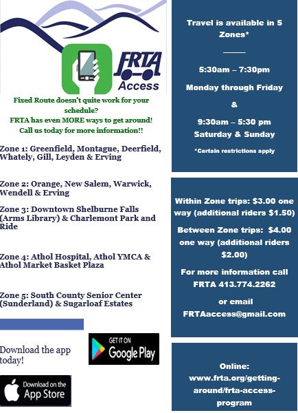 Call our schedulers at 413.774.2262 ext. 0 for more information on this new program or email us at FRTAaccess@gmail.com.